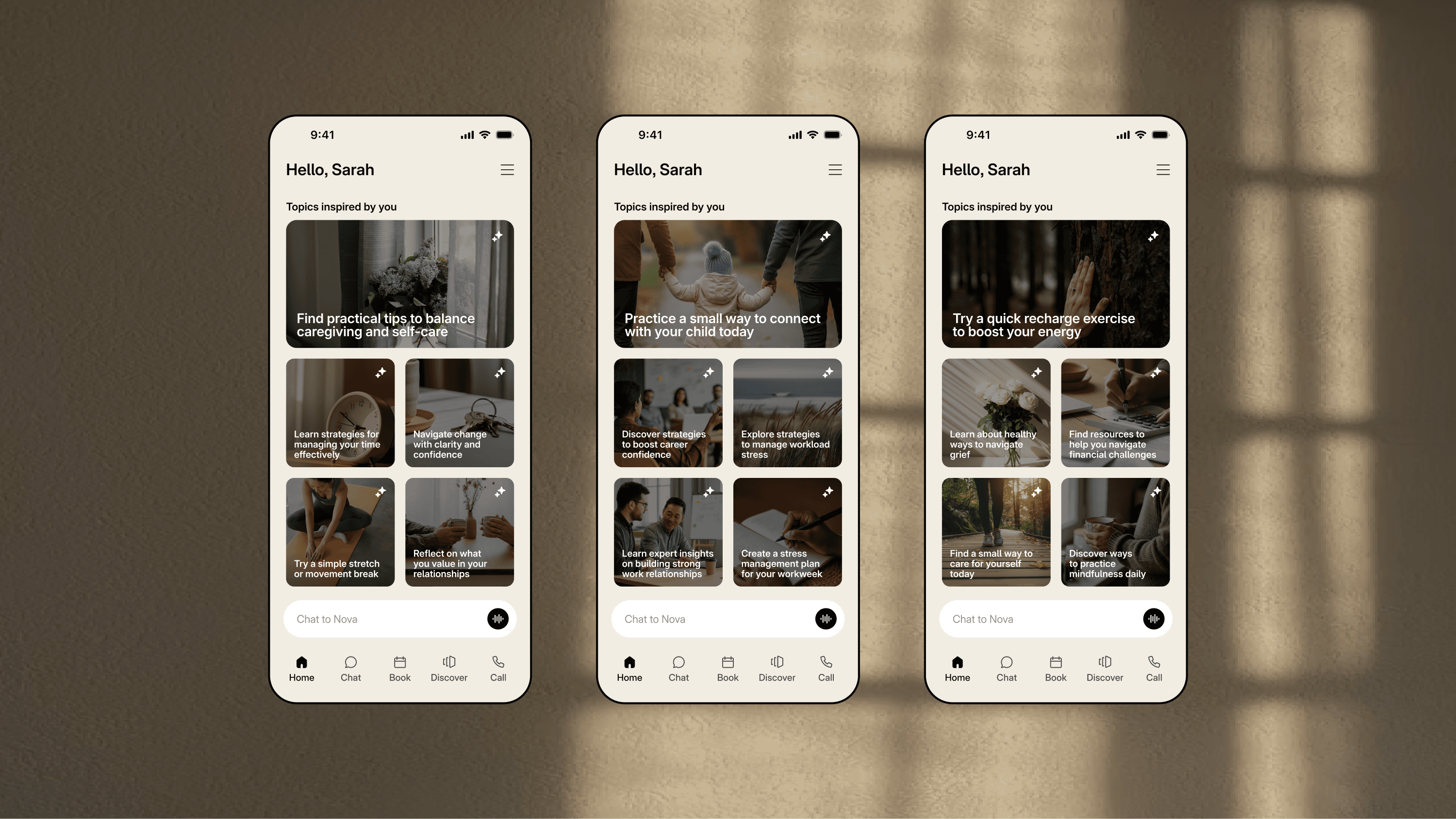 The hardest part of seeking support isn't always the conversation itself - it's knowing where to begin. We launched Nova as a pure chat interface, knowing this wouldn't be enough long-term. Retention was low and feedback showed some users weren't naturally drawn to AI chatbots. After reviewing conversation transcripts, I noticed clear patterns in what people talked about and saw an opportunity: instead of waiting for users to think of topics, we could actively suggest them.