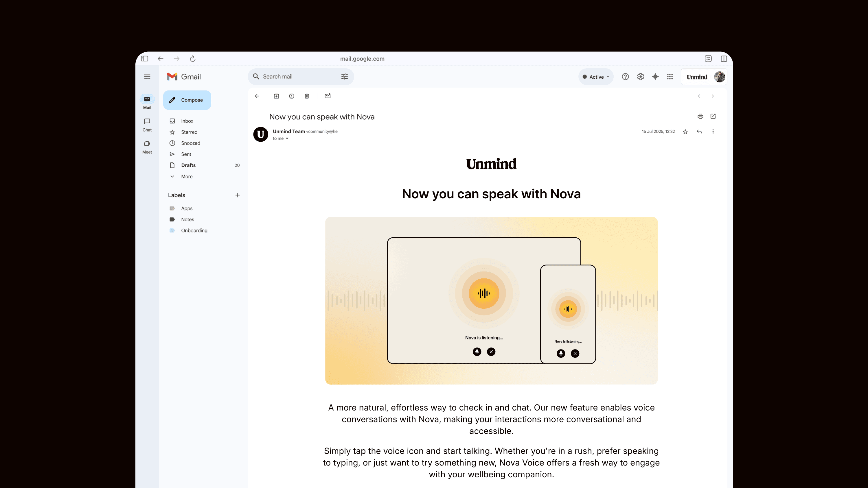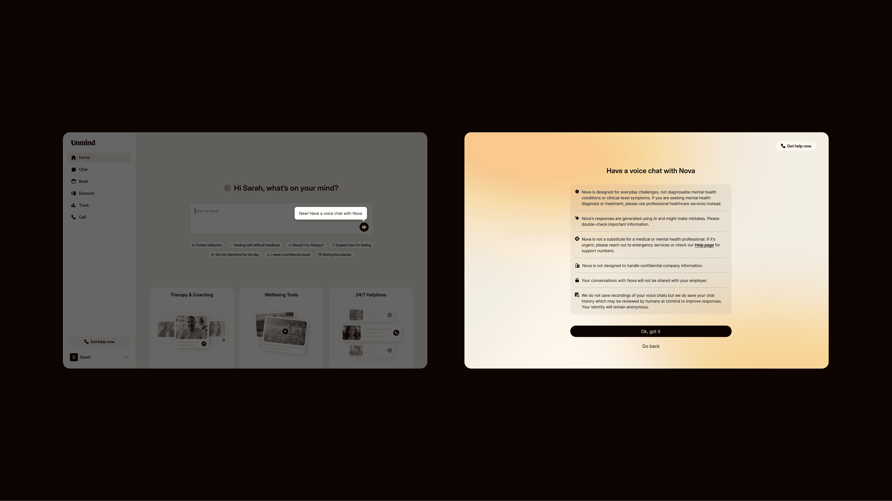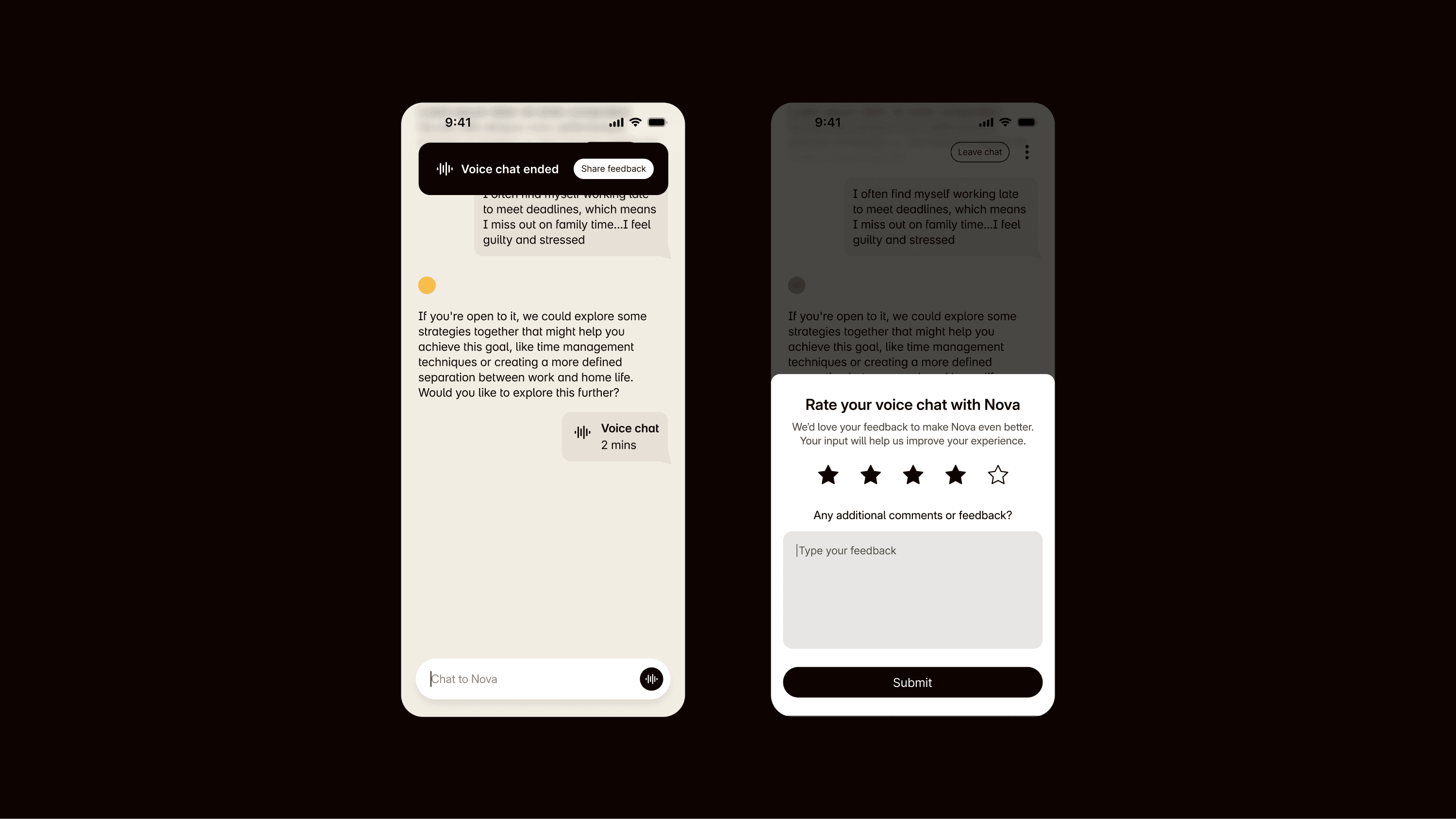 Nova launched in 2023 as a text-based AI mental health coach. From day one, clients and users asked for voice mode. It's a more natural way to talk through difficult moments, and people speak around 3x faster than they type. In a mental health context, that meant taking extra care with safety and conversation quality, and making sure we weren't just recreating a common AI chatbot experience but building something that felt uniquely supportive. Done right, voice also had the potential to unlock deeper, more natural conversations and better support outcomes.